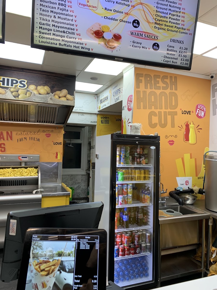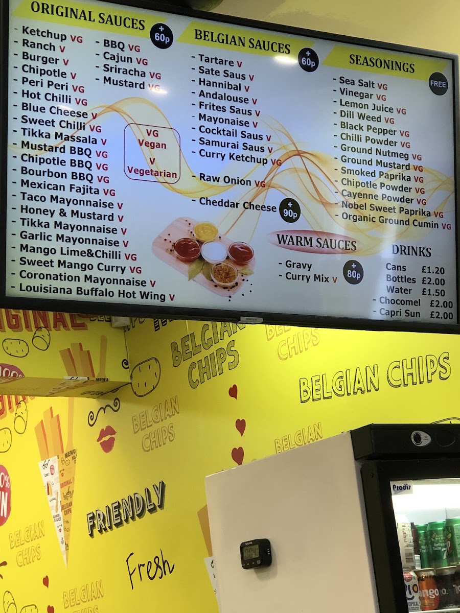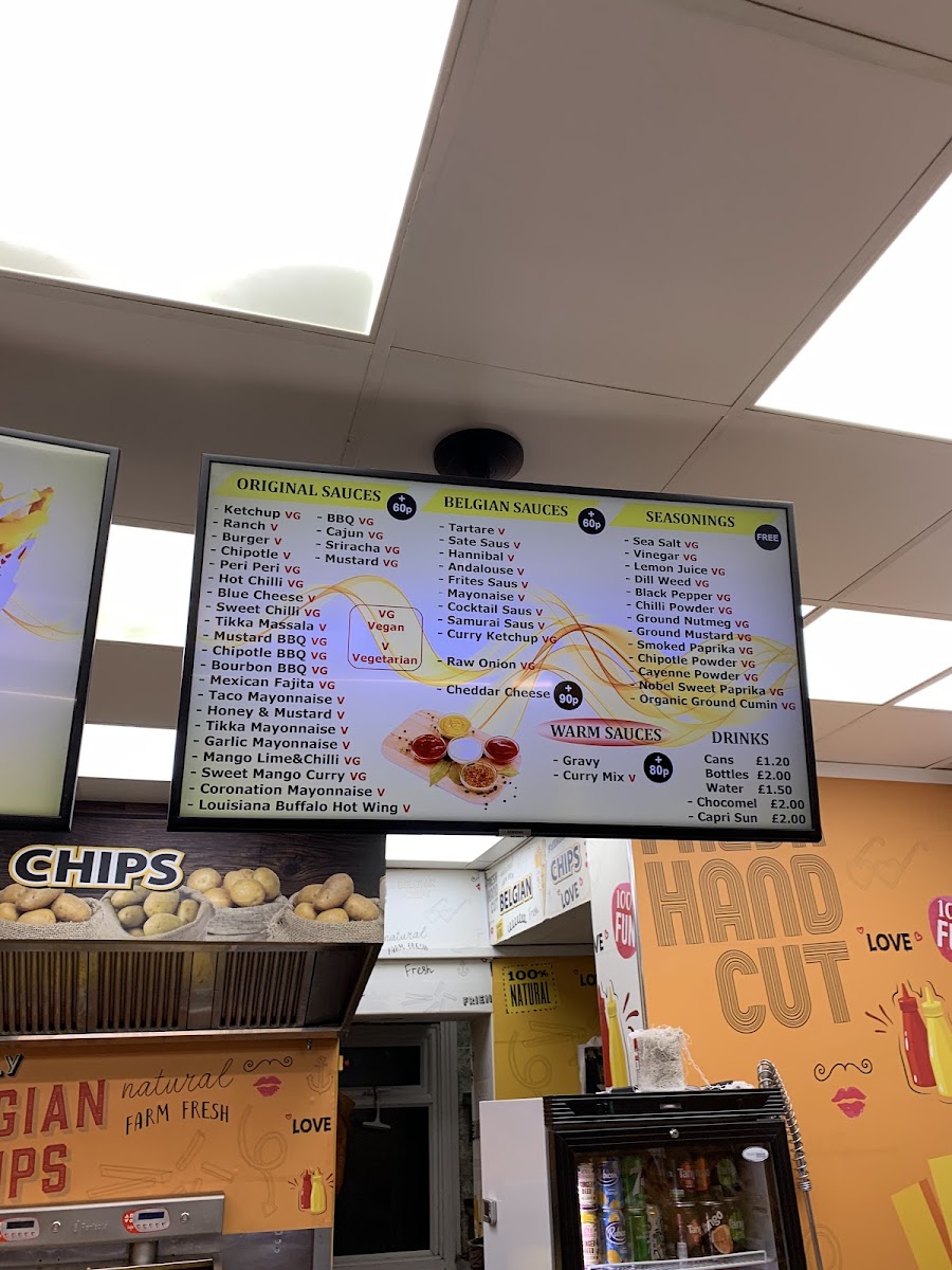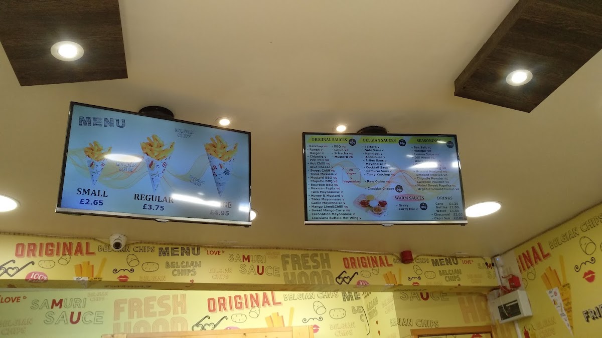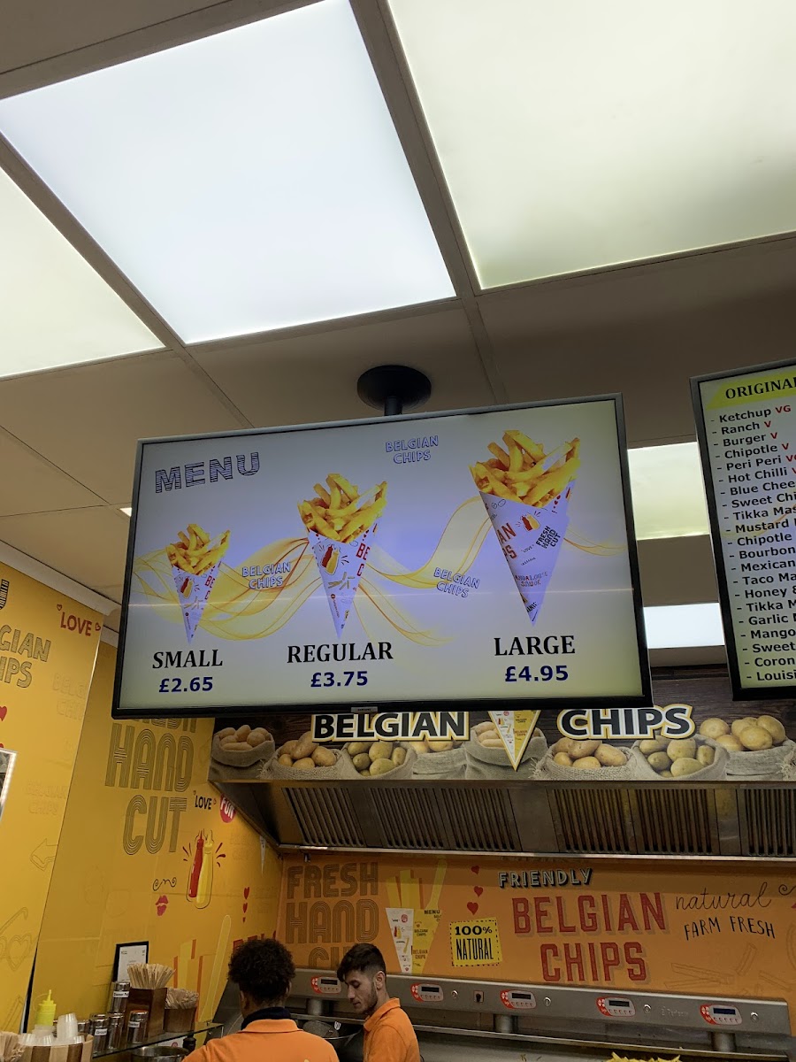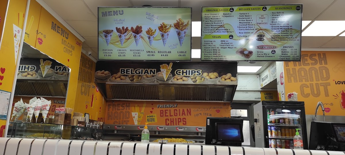 At Belgian Chips, the menu wraps you in simple, bold flavours built around their signature chips and an array of sauces that elevate what might otherwise be a straightforward snack. Diners can choose their chips in different sizes with prices such as Small Chips Box £4.50, Regular Chips Box £7.50, and Large Chips Box £10.50, each accompanied by an assortment of house sauces like Tartare, Sate Saus, Hannibal Andalouse, and Frites Saus to tailor every bite. On the sauce front, classics like Ranch, Chipotle BBQ, and Honey & Mustard sit alongside tangy originals, and further choices such as Mustard BBQ, Bourbon BBQ, Taco Mayonnaise, Garlic Mayonnaise and Mango Lime & Chilli add depth to the fries experience. Thirst‑quenching options include Cans and Bottles of soft drinks, Water, Chocomel, and Capri Sun, rounding out a menu that’s casual, fun, and focused on big‑flavoured snacks.